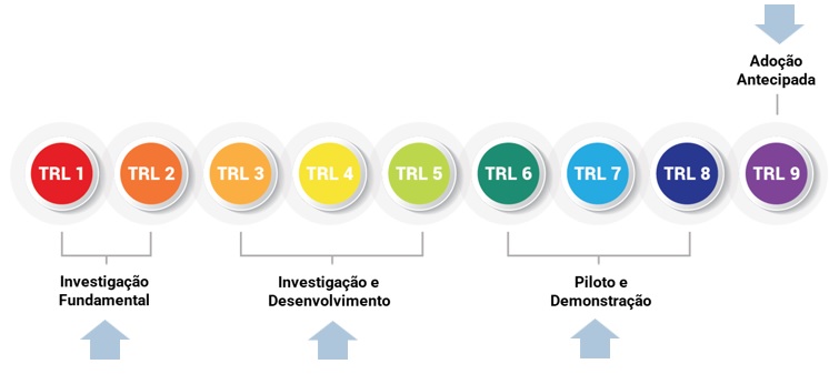 O nível 1 (mais baixo) corresponde ao início da investigação, enquanto que o nível 9 (mais alto), diz respeito à operacionalização ou comercialização da tecnologia, sistema ou solução tecnológica em questão.
